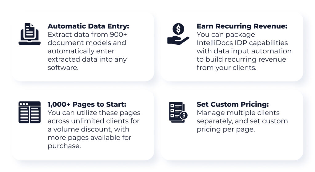 O IntelliDocs é o melhor provedor de serviços de TI IDP – dando a você o poder de gerenciar vários clientes finais em fluxos separados, ao mesmo tempo em que define preços personalizados por página. Desbloqueie todo o potencial do seu negócio e leve a sua oferta de serviços para o próximo nível.
